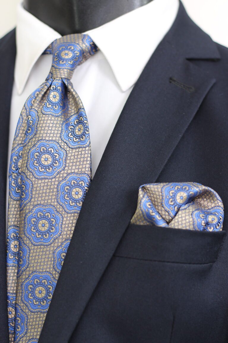 A sophisticated tie and accessory set featuring a luminous taupe/gold background with a striking, intricate micro-geometric clover pattern in navy blue and light blue.