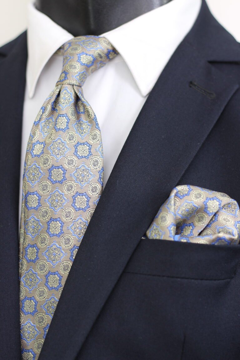 A sophisticated tie and accessory set featuring a shimmering silver-gold background with a striking, intricate small geometric medallion pattern in light blue and navy.