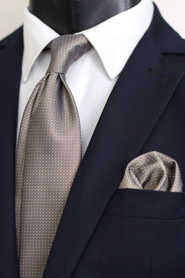 A sophisticated tie and accessory set featuring a classic tan background with a subtle, intricate pattern of fine blue and brown dots. The pocket square is accented with a navy blue border.