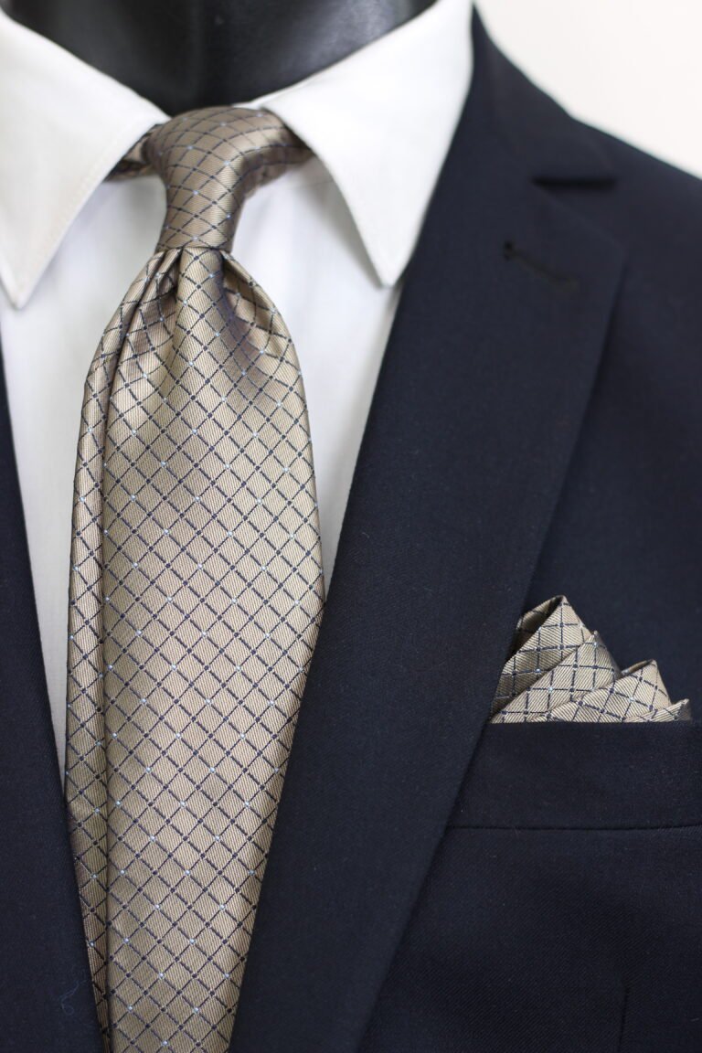 A sophisticated tie and accessory set featuring a luminous light taupe/gold background with a striking, intricate diamond/argyle lattice pattern in navy blue and black.