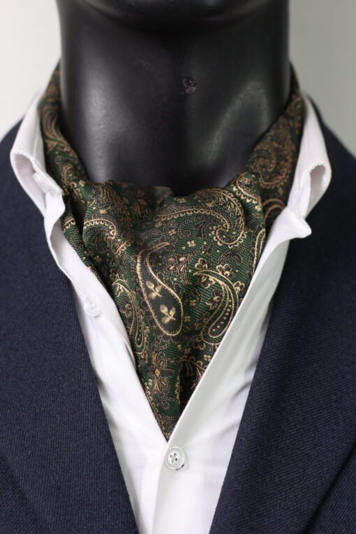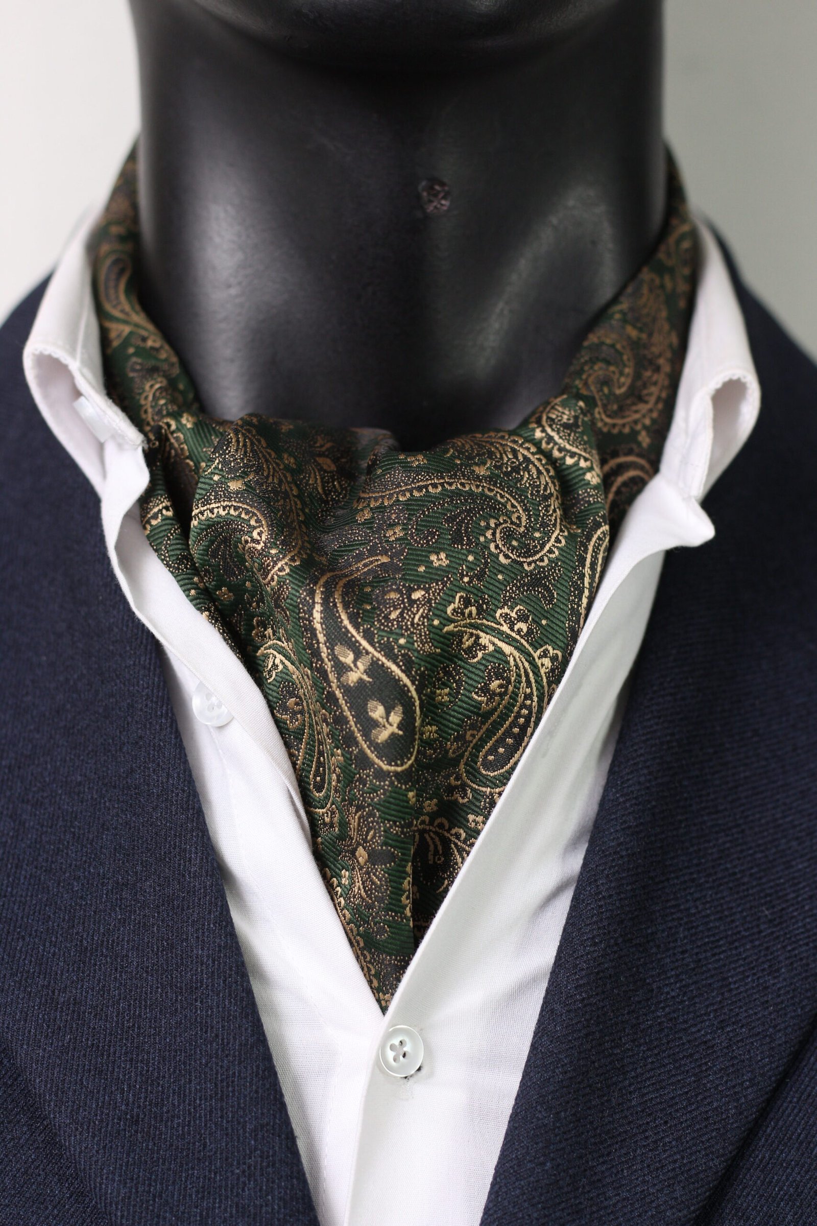 Make a striking statement with this exquisite dark green and gold paisley ascot scarf for men. This richly patterned neck accessory, worn gracefully around the neck, features a distinctive and sophisticated paisley design, making it an ideal choice for adding a touch of classic elegance to your ensemble.