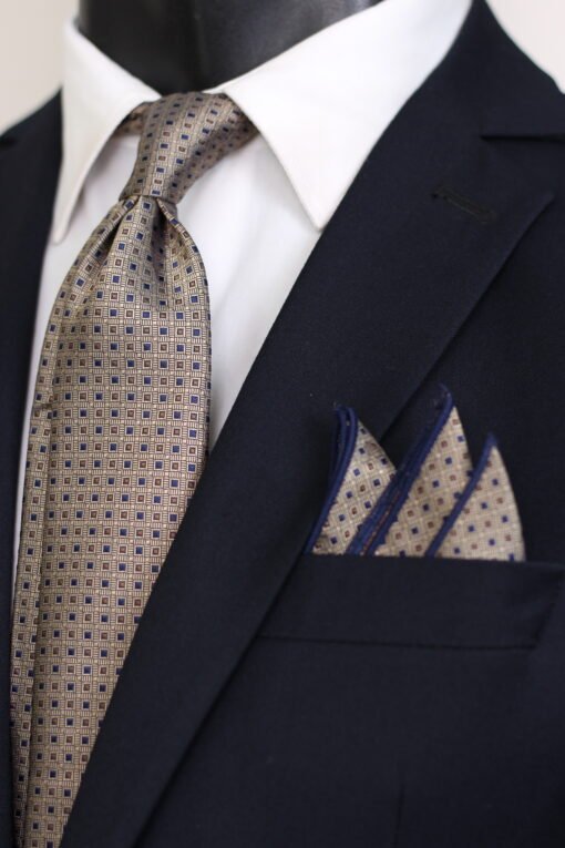 Make a striking statement with this exquisite patterned men’s tie and complementary pocket square. This richly textured neckwear accessory, elegantly presented as part of a suit, features a sophisticated and distinctive all-over jacquard pattern of fine, blue and brown dots on a neutral tan background. The coordinated pocket square is highlighted by a deep navy blue border, adding a touch of classic sophistication and bold visual interest to your ensemble, with the added benefit of a perfectly coordinated pocket square for a polished finish.