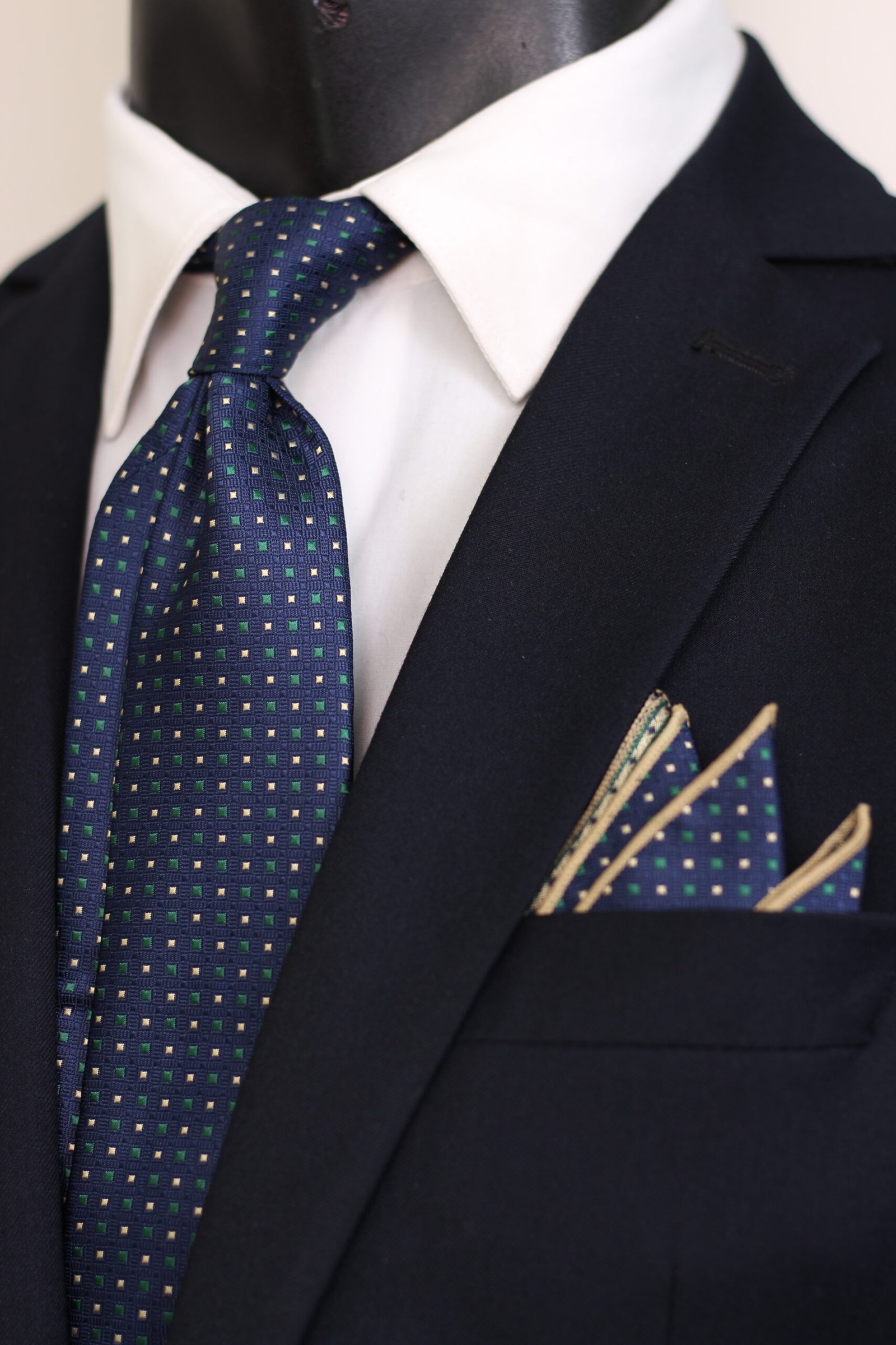 Show your elegance with this luxurious men’s necktie and matching pocket square. A sophisticated tie and accessory set featuring a classic navy blue background with a subtle, intricate green and pink polka dot pattern. It’s perfect for weddings, formal events, and smart style.