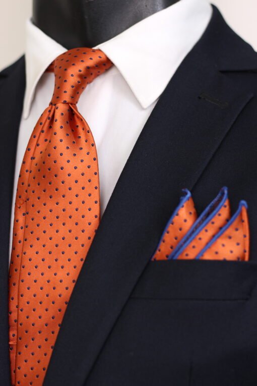 Make a striking statement with this exquisite patterned men’s tie and complementary pocket square. This richly textured neckwear accessory, elegantly presented as part of a suit, features a sophisticated and distinctive all-over jacquard pattern of fine navy blue dots on a vibrant orange background. The coordinated pocket square is highlighted by a vibrant light blue border, adding a touch of classic sophistication and bold visual interest to your ensemble, with the added benefit of a perfectly coordinated pocket square for a polished finish.