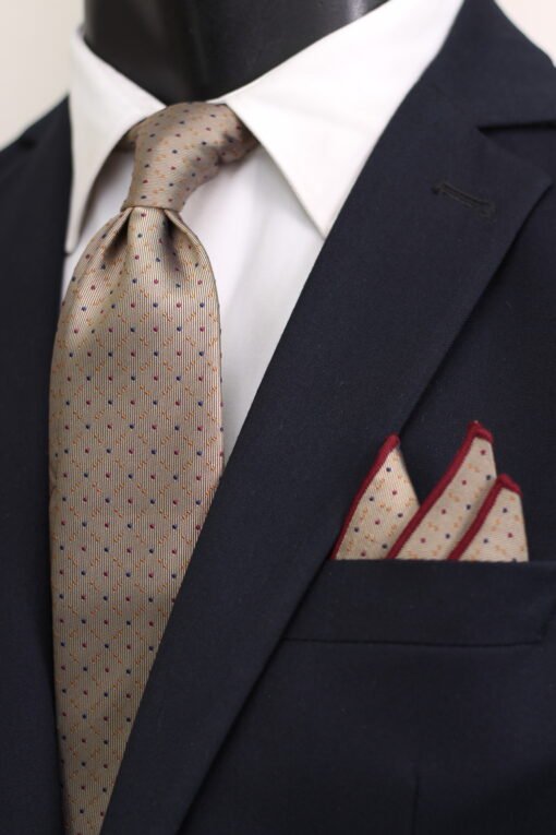 Make a striking statement with this exquisite patterned men’s tie and complementary pocket square. This richly textured neckwear accessory, elegantly presented as part of a suit, features a sophisticated and distinctive all-over jacquard pattern of fine, blue and red dots on a neutral tan background. The coordinated pocket square is highlighted by a deep burgundy border, adding a touch of classic sophistication and bold visual interest to your ensemble, with the added benefit of a perfectly coordinated pocket square for a polished finish.