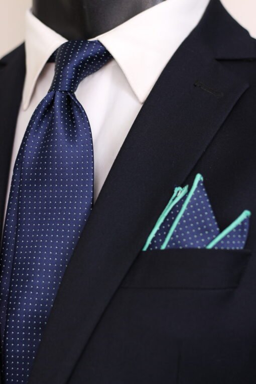 Make a striking statement with this exquisite patterned men’s tie and complementary pocket square. This richly textured neckwear accessory, elegantly presented as part of a suit, features a sophisticated and distinctive all-over jacquard pattern of fine, light dots on a deep navy blue background. The coordinated pocket square is highlighted by a vibrant mint green border, adding a touch of classic sophistication and bold visual interest to your ensemble, with the added benefit of a perfectly coordinated pocket square for a polished finish.