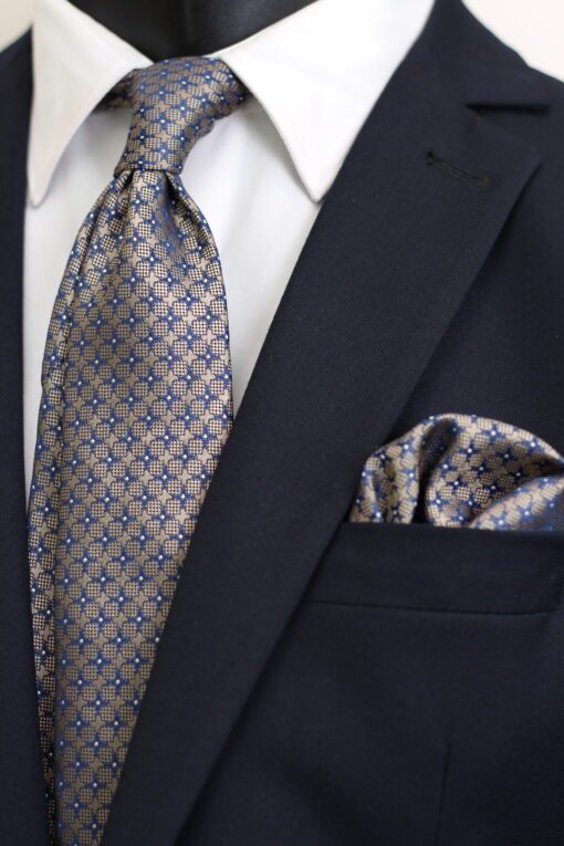This richly textured neckwear accessory, elegantly presented as part of a suit, features a sophisticated and distinctive all-over jacquard micro-geometric star/cross pattern in a brilliant gold-beige with prominent deep blue motifs.