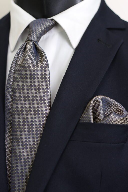 ✨ Elegant Navy and Tan/Gold Micro-Geometric Square Patterned Tie and Pocket Square: This tie and matching pocket square showcase a striking navy blue tone with bold tan/gold geometric patterns, giving them a timeless and polished appearance with a modern touch.