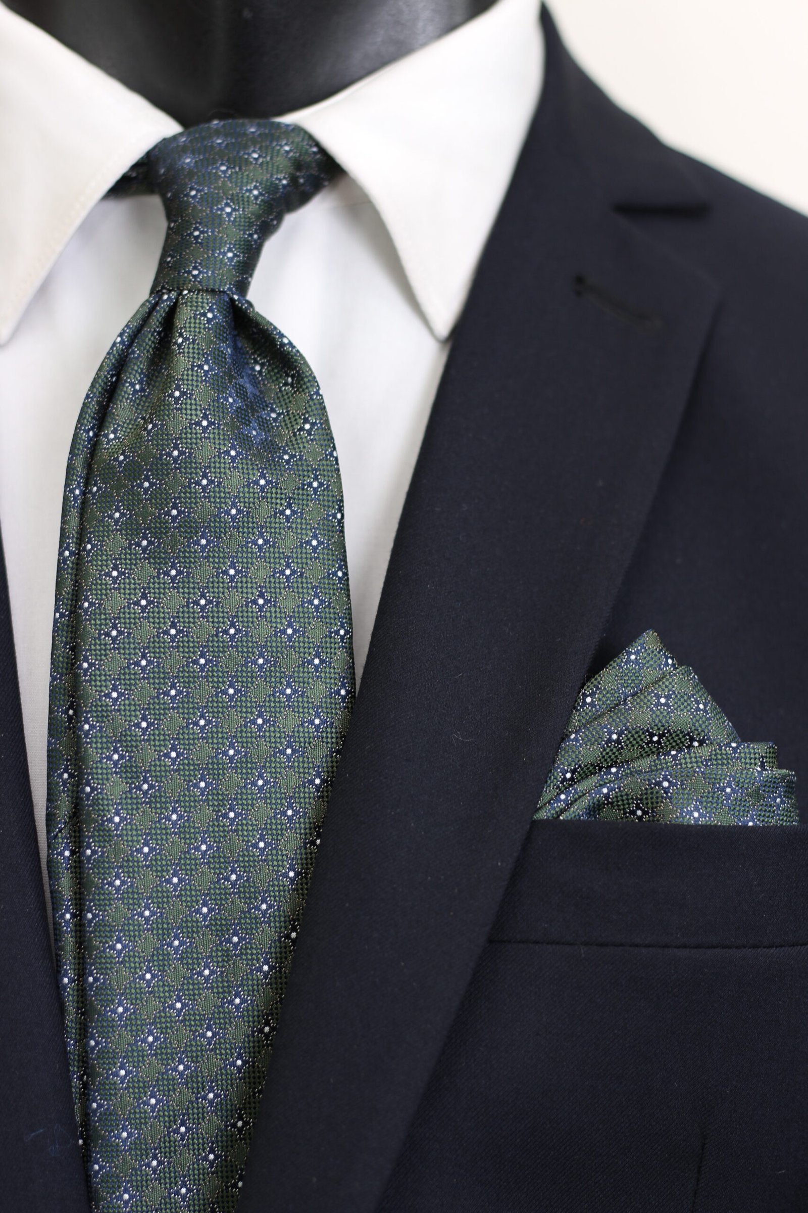 This richly textured neckwear accessory, elegantly presented as part of a suit, features a sophisticated and distinctive all-over jacquard pattern of tiny four-dot geometric clusters in contrasting navy blue and white, set against a lush moss green fabric.