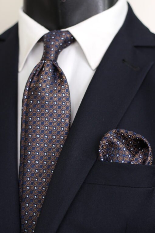 ✨ Elegant Navy and Brown/White Geometric Patterned Tie and Pocket Square: This tie and matching pocket square showcase a striking navy blue tone with bold brown and white geometric patterns, giving them a timeless and polished appearance with a modern touch.