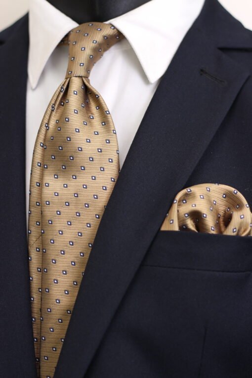 ✨ Elegant Bronze/Gold and Navy Micro-Geometric Patterned Tie and Pocket Square: This tie and matching pocket square showcase a striking bronze/gold tone with bold navy blue geometric patterns, giving them a timeless and polished appearance with a modern touch.