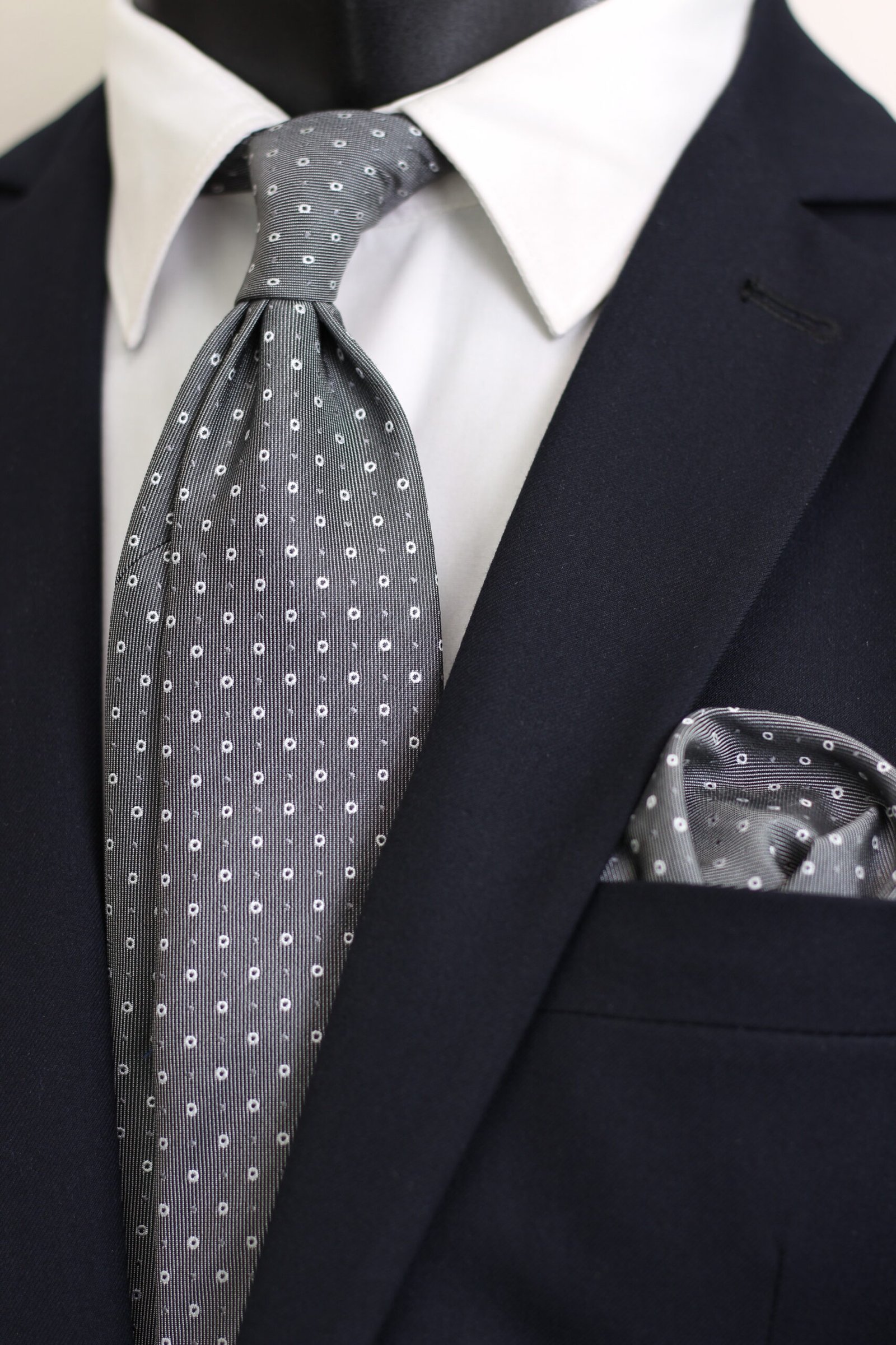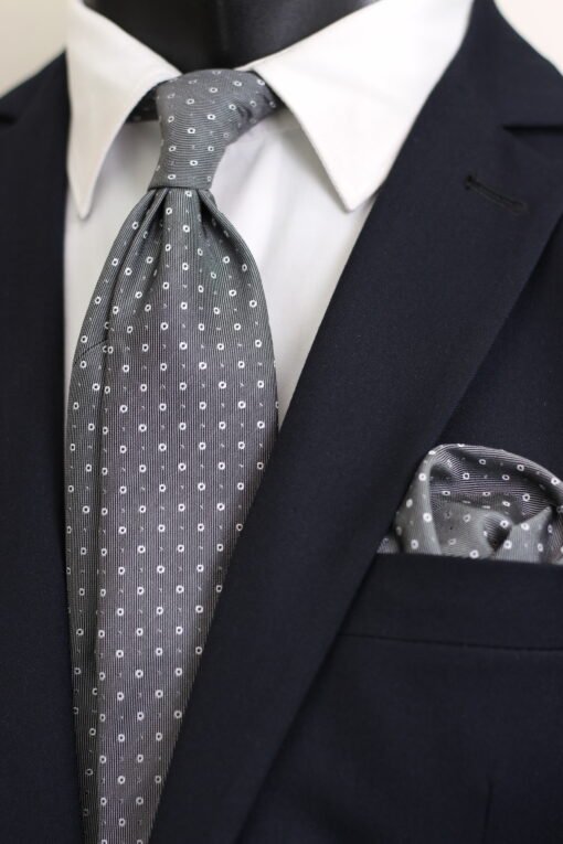 ✨ Elegant Charcoal Gray and White Micro-Dot Patterned Tie and Pocket Square: This tie and matching pocket square showcase a striking charcoal gray tone with bold white dot patterns, giving them a timeless and polished appearance with a modern touch.