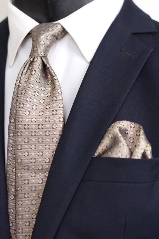 ✨ Elegant Taupe/Gold and Navy/Blue Micro-Geometric Patterned Tie and Pocket Square: This tie and matching pocket square showcase a striking taupe/gold tone with bold navy blue geometric patterns, giving them a timeless and polished appearance with a modern touch.