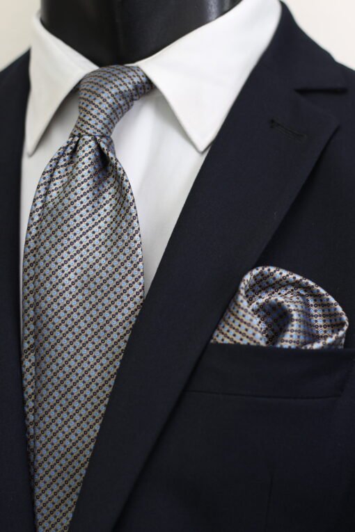 ✨ Elegant Light Gray-Taupe and Black/Blue Geometric Patterned Tie and Pocket Square: This tie and matching pocket square showcase a striking light gray-taupe tone with subtle black and light blue geometric patterns, giving them a timeless and polished appearance with a modern touch.