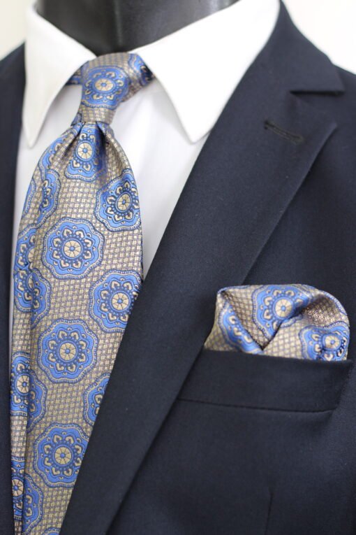 ✨ Elegant Gold and Blue Floral Medallion Patterned Tie and Pocket Square: This tie and matching pocket square showcase a striking gold-beige tone with bold blue floral medallion patterns, giving them a timeless and polished appearance with a modern touch.