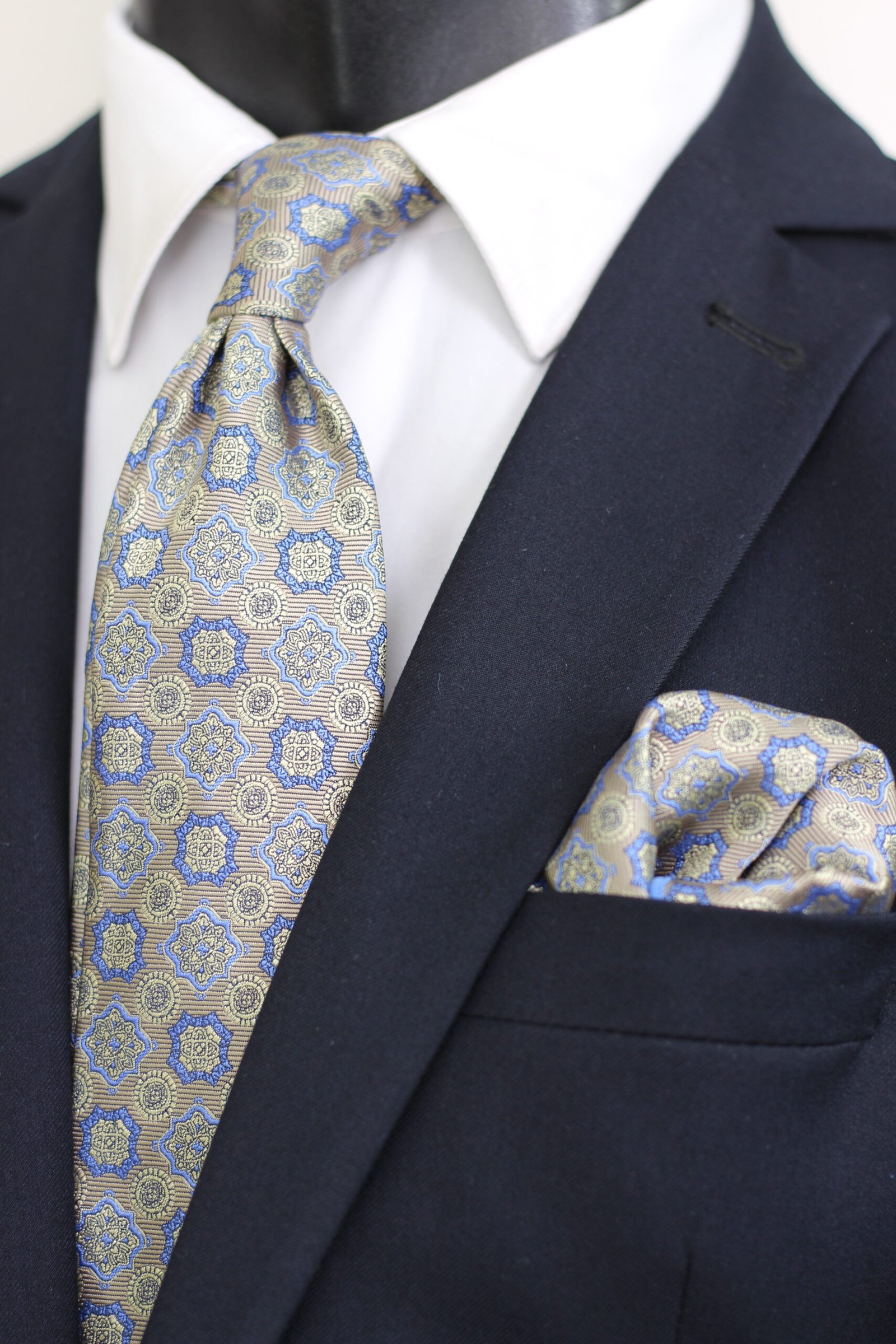 ✨ Elegant Silver-Gold and Blue Geometric Medallion Patterned Tie and Pocket Square: This tie and matching pocket square showcase a striking silver-gold tone with bold blue geometric medallion patterns, giving them a timeless and polished appearance with a modern touch.