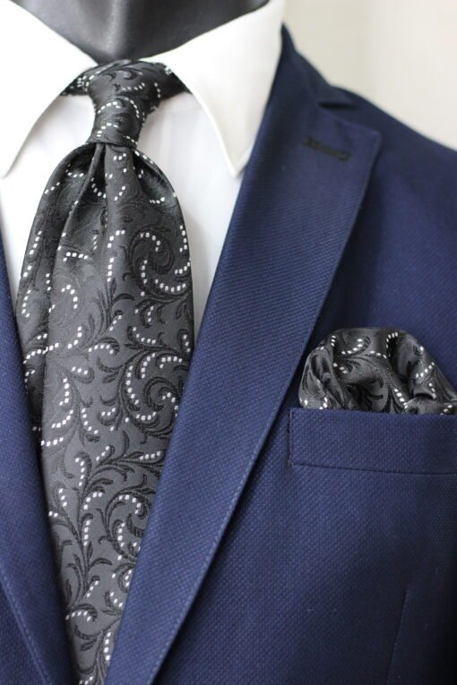 Make a striking statement with this exquisite patterned men’s tie and complementary pocket square. This richly textured neckwear accessory, elegantly presented as part of a suit, features a sophisticated and distinctive all-over jacquard pattern in a deep grey with tonal floral and scroll motifs and scattered white speckles. It’s an ideal choice to add a touch of classic sophistication and subtle visual interest to your ensemble, with the added benefit of a perfectly coordinated pocket square for a polished finish.