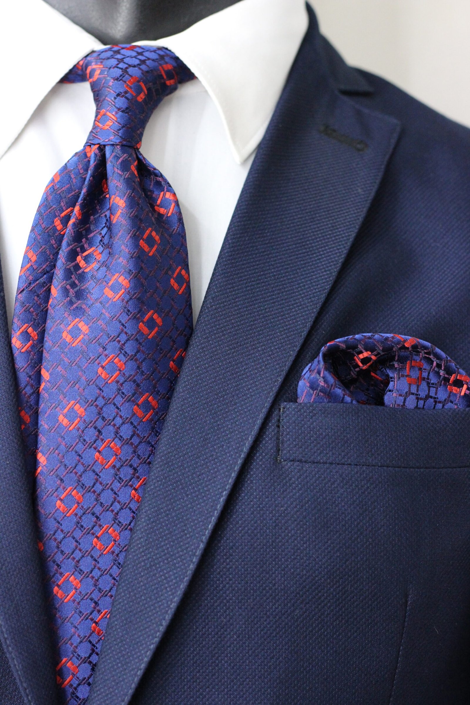 Make a striking statement with this exquisite patterned men’s tie and complementary pocket square. This richly textured neckwear accessory, elegantly presented as part of a suit, features a sophisticated and distinctive all-over jacquard pattern in a vibrant blue with prominent red square geometric motifs. It’s an ideal choice to add a touch of classic sophistication and bold visual interest to your ensemble, with the added benefit of a perfectly coordinated pocket square for a polished finish.