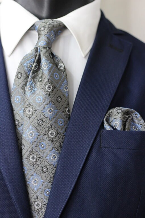 Make a striking statement with this exquisite patterned men’s tie and complementary pocket square. This richly textured neckwear accessory, elegantly presented as part of a suit, features a sophisticated and distinctive all-over jacquard pattern in a light grey with an intricate medallion and geometric design in blue and black. It’s an ideal choice to add a touch of classic sophistication and subtle visual interest to your ensemble, with the added benefit of a perfectly coordinated pocket square for a polished finish.