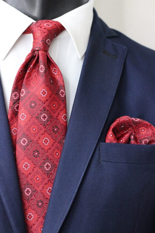 This richly textured neckwear accessory, elegantly presented as part of a suit, features a sophisticated and distinctive all-over jacquard geometric pattern in a vibrant deep red with prominent black and white motifs.