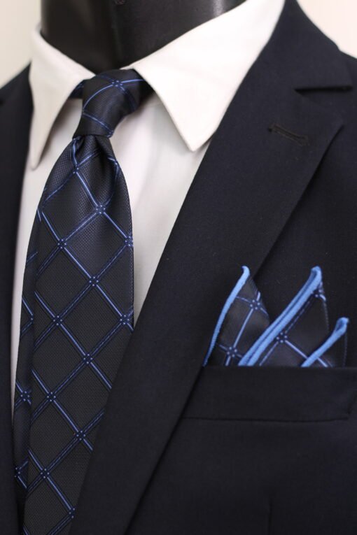 Show your class with this luxurious men’s necktie and matching pocket square. A sophisticated tie and accessory set featuring a rich navy blue color with a subtle textured diamond pattern. It’s perfect for business, formal events, and classic style.