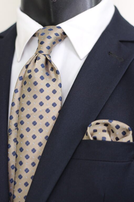 This richly textured neckwear accessory, elegantly presented as part of a suit, features a sophisticated and distinctive all-over jacquard pattern of repeating small geometric squares in navy blue, each containing a subtle light blue center detail, set against a shimmering tan/gold fabric.