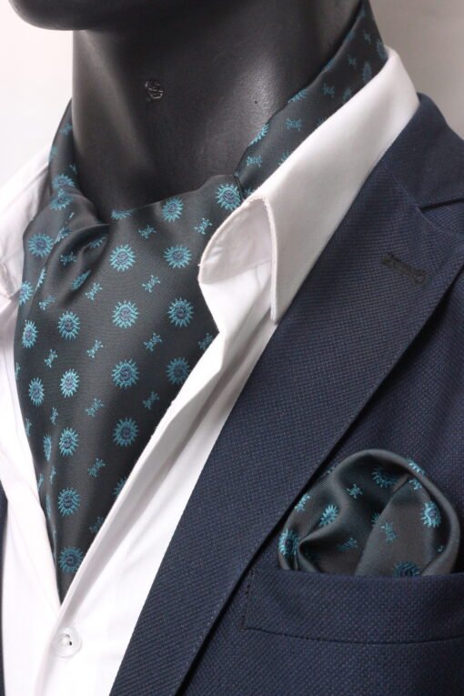 Make a striking statement with this exquisite dark grey and black graphic patterned ascot scarf for men. This richly patterned neck accessory, worn gracefully around the neck, features a distinctive and sophisticated graphic design with subtle teal accents. It makes an ideal choice for adding a touch of classic elegance to your ensemble. It also comes with a matching hanky for a complete look.