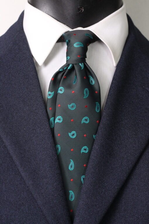 Make a striking statement with this exquisite patterned tie for men. This richly textured neck tie accessory, worn gracefully around the neck, features a distinctive and sophisticated small paisley design in teal, accented with red dots, against a dark grey background. It makes an ideal choice for adding a touch of classic elegance to your ensemble.