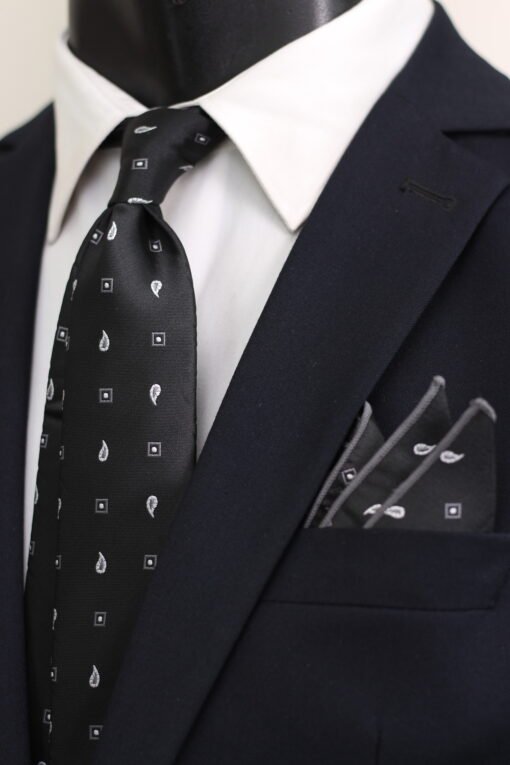 Make a striking statement with this exquisite patterned men’s tie and complementary pocket square. This richly textured neckwear accessory, elegantly presented as part of a suit, features a sophisticated and distinctive all-over jacquard paisley and square pattern in a classic black with prominent white motifs. It’s an ideal choice to add a touch of classic sophistication and bold visual interest to your ensemble, with the added benefit of a perfectly coordinated pocket square for a polished finish.