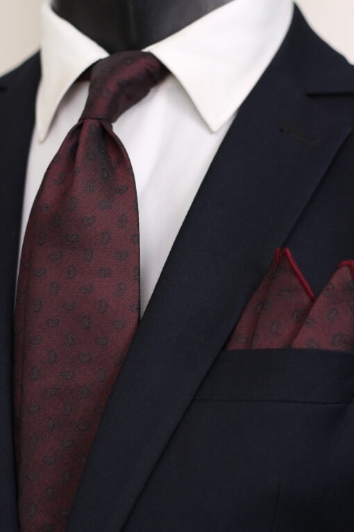 Make a striking statement with this exquisite patterned men’s tie and complementary pocket square. This richly textured neckwear accessory, elegantly presented as part of a suit, features a sophisticated and distinctive all-over jacquard tonal paisley and polka dot pattern in a vibrant burgundy with prominent darker tonal motifs. It’s an ideal choice to add a touch of classic sophistication and bold visual interest to your ensemble, with the added benefit of a perfectly coordinated pocket square for a polished finish.