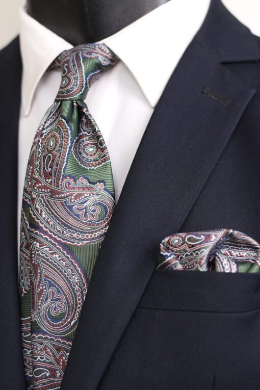 A sophisticated tie and accessory set featuring a prominent olive green background with a striking, intricate multi-colored paisley pattern, including tones of red, blue, and tan.