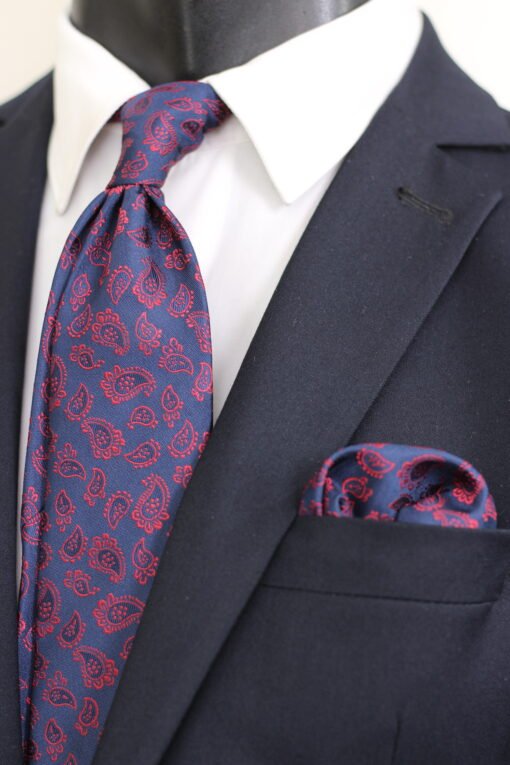 ✨ Elegant Navy and Red Paisley Patterned Tie and Pocket Square: This tie and matching pocket square showcase a striking navy tone with bold vibrant red paisley patterns, giving them a timeless and polished appearance with a modern touch.