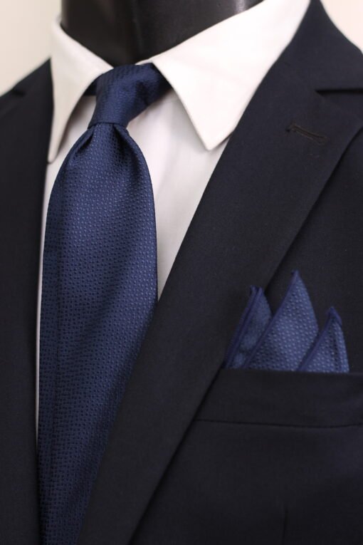 Make a striking statement with this exquisite solid men’s tie and complementary pocket square. This richly textured neckwear accessory, elegantly presented as part of a suit, features a sophisticated and distinctive all-over jacquard dotted pattern in a vibrant navy blue. It’s an ideal choice to add a touch of classic sophistication and visual interest to your ensemble, with the added benefit of a perfectly coordinated pocket square for a polished finish.