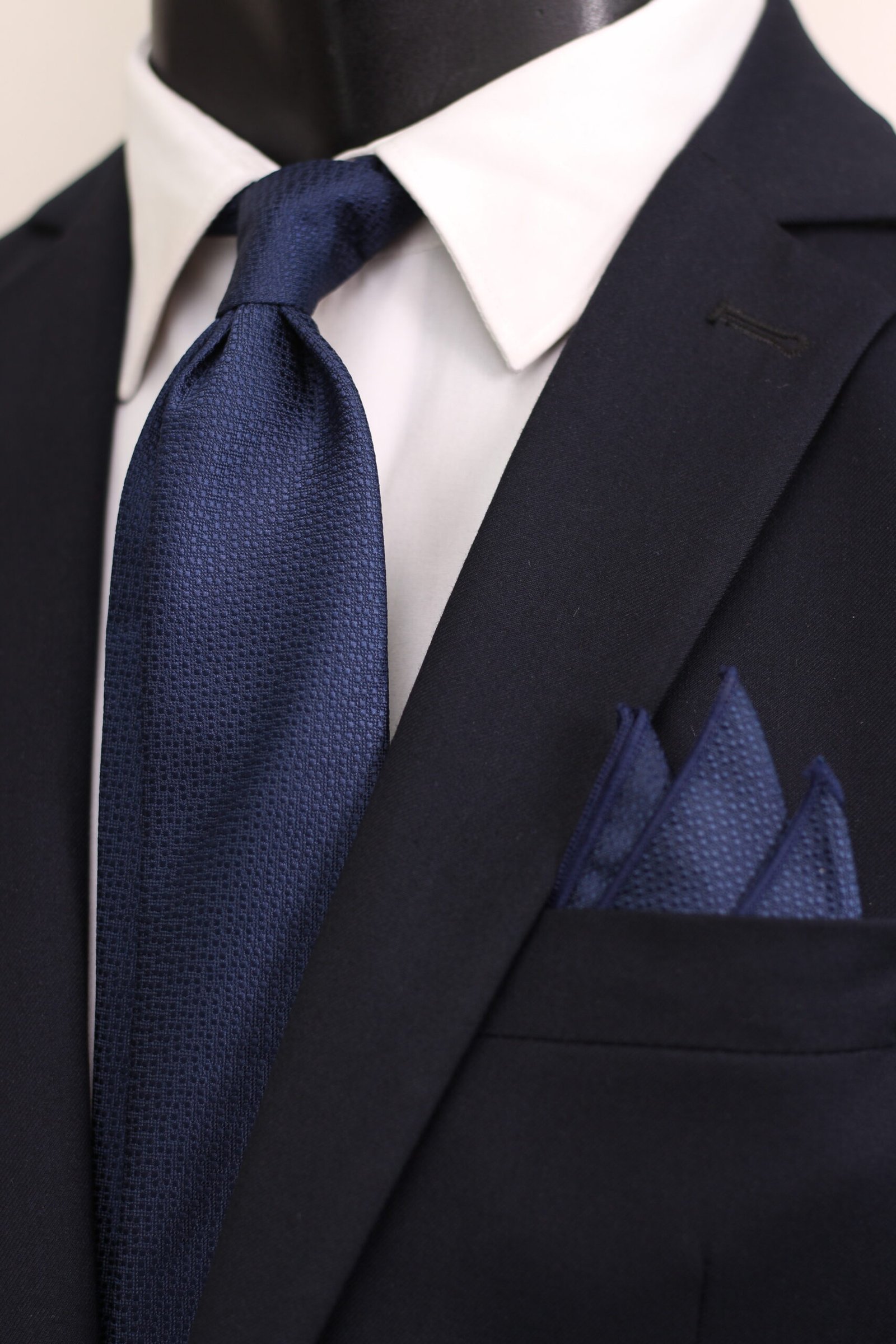 Show your class with this luxurious men’s necktie and matching pocket square. A sophisticated tie and accessory set featuring a rich, solid navy blue color with a subtle textured pattern. It’s perfect for business, formal events, and classic style.