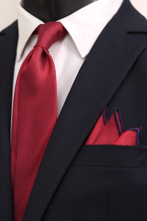 Make a striking statement with this exquisite solid men’s tie and complementary pocket square. This richly textured neckwear accessory, elegantly presented as part of a suit, features a sophisticated and distinctive all-over jacquard dotted pattern in a vibrant burgundy. It’s an ideal choice to add a touch of classic sophistication and visual interest to your ensemble, with the added benefit of a perfectly coordinated pocket square for a polished finish. The pocket square has a subtle navy blue trim, which adds a unique touch.