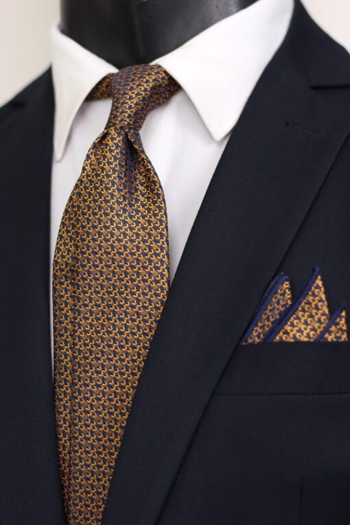 Make a striking statement with this exquisite patterned men’s tie and complementary pocket square. This richly textured neckwear accessory, elegantly presented as part of a suit, features a sophisticated and distinctive all-over jacquard pattern in a vibrant gold and copper with prominent navy blue motifs. It’s an ideal choice to add a touch of classic sophistication and visual interest to your ensemble, with the added benefit of a perfectly coordinated pocket square for a polished finish. The pocket square has a subtle navy blue trim, which adds a unique touch.