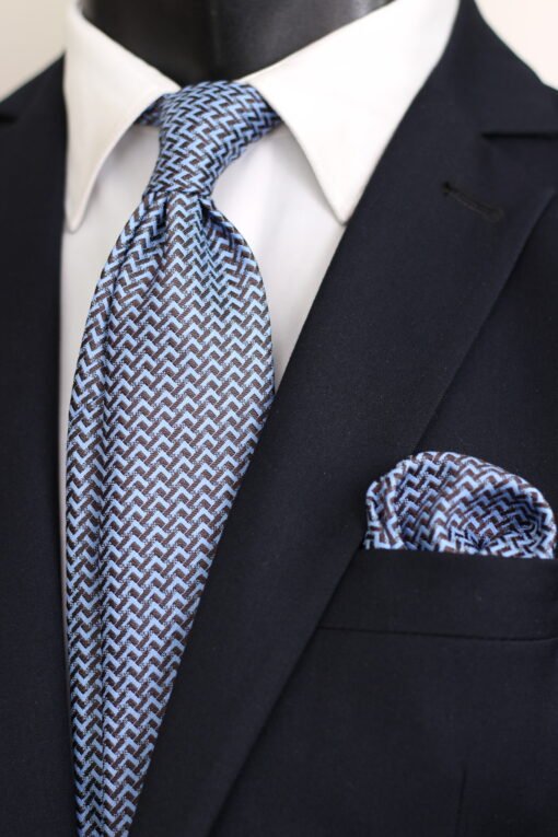 ✨ Elegant Light Blue and Dark Brown Geometric Zig-Zag Patterned Tie and Pocket Square: This tie and matching pocket square showcase a striking light blue tone with bold dark brown geometric patterns, giving them a timeless and polished appearance with a modern touch.