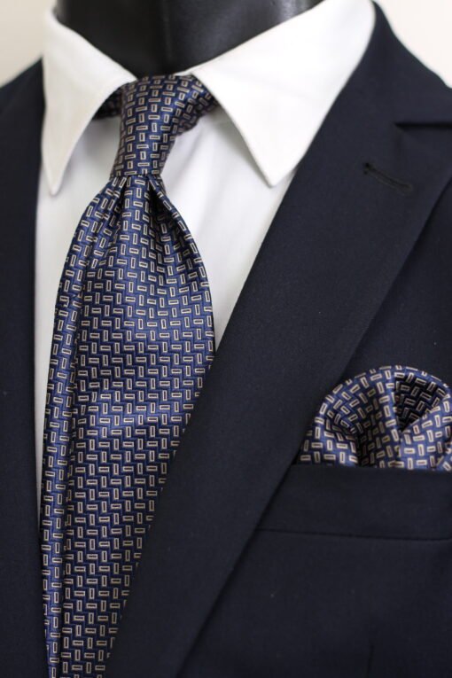 ✨ Elegant Navy Blue and Tan/Gold Geometric Link Patterned Tie and Pocket Square: This tie and matching pocket square showcase a striking navy blue tone with contrasting tan/gold geometric patterns, giving them a timeless and polished appearance with a modern touch.