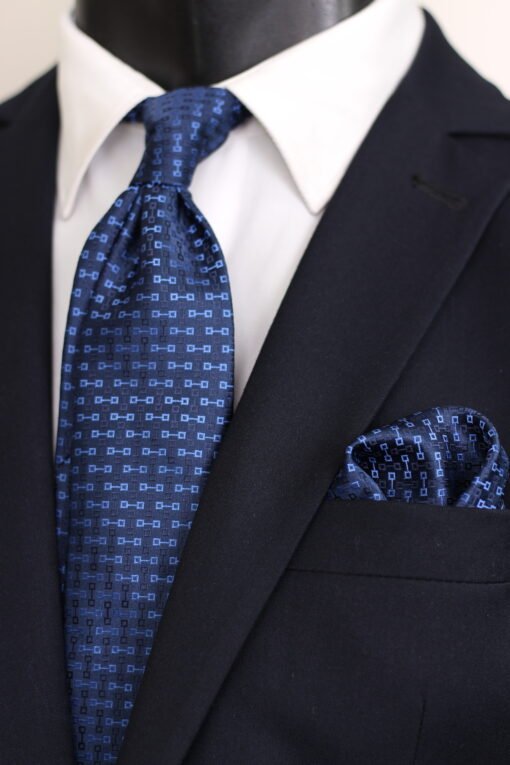 ✨ Elegant Royal Blue Tonal Geometric Link Patterned Tie and Pocket Square: This tie and matching pocket square showcase a striking royal blue tone with a tonal geometric pattern, giving them a timeless and polished appearance with a modern touch.