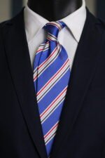 Elevate your formal attire with this distinguished blue silk tie, showcasing a modern and eye-catching pattern of diagonal stripes in vibrant blue with accents of bold red, crisp white, and elegant grey. This men’s silk tie is a versatile and stylish choice, ideal for enhancing your look for important business meetings, weddings, or any special occasion where a refined appearance with a contemporary flair is key. Crafted with meticulous attention to detail from luxurious silk jacquard, this elegant necktie is a valuable addition to any gentleman’s collection of men’s fashion accessories. Discover our extensive selection of high-quality striped silk ties and modern men’s formal wear to complete your sophisticated style.