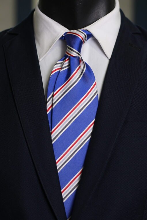 Stylish Blue Striped Silk Tie with Red, White, and Grey Accents – Modern Men’s Neckwear for Business and Formal Attire (Shop Our Silk Striped Tie Collection)