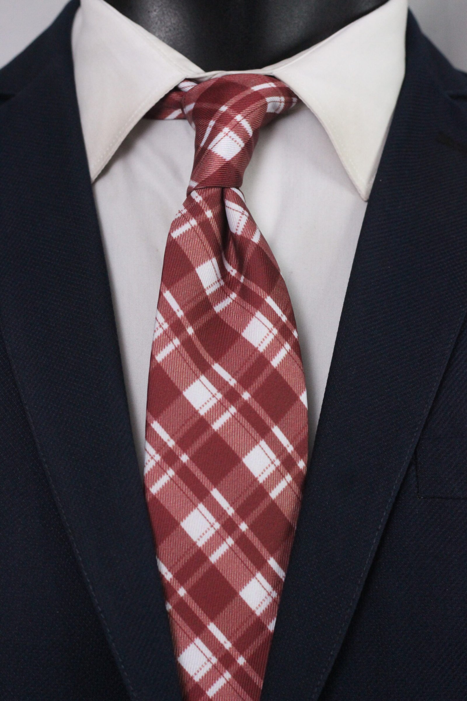 Make a striking statement with this exquisite patterned men’s tie. This richly textured neckwear accessory, elegantly presented as part of a suit, features a sophisticated and distinctive plaid pattern in shades of red and white. It’s an ideal choice to add a touch of classic sophistication and a timeless appeal to your ensemble.