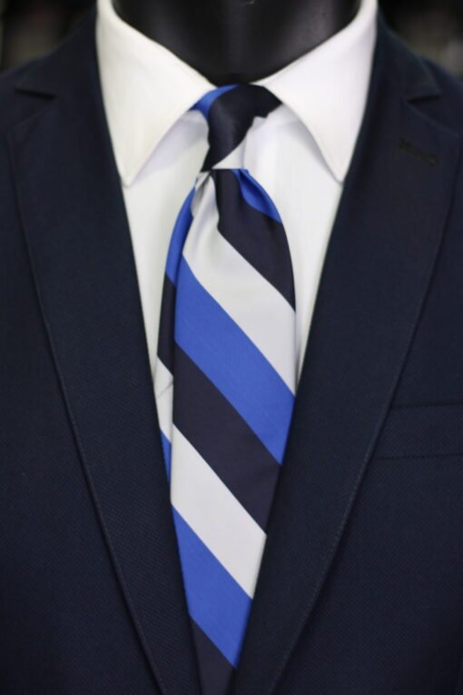 Make a striking statement with this exquisite patterned men’s tie. This richly textured neckwear accessory, elegantly presented as part of a suit, features a sophisticated and distinctive pattern of uniformly spaced diagonal stripes in eye-catching shades of vibrant royal blue, pure white, and classic navy. It’s an ideal choice to add a touch of modern sophistication and subtle visual interest to your ensemble.
