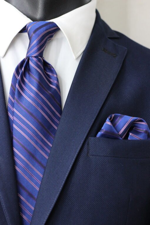 Make a striking statement with this exquisite patterned men’s tie and complementary pocket square. This richly textured neckwear accessory, elegantly presented as part of a suit, features a sophisticated and distinctive all-over pattern of diagonal stripes in varying shades of blue, purple, and hints of black. It’s an ideal choice to add a touch of classic sophistication and subtle visual interest to your ensemble, with the added benefit of a perfectly coordinated pocket square for a polished finish.