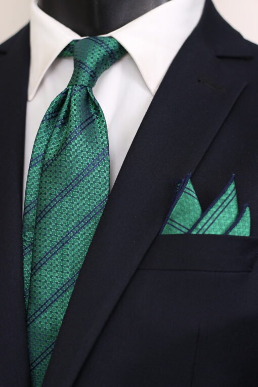 Make a striking statement with this exquisite patterned men’s tie and complementary pocket square. This richly textured neckwear accessory, elegantly presented as part of a suit, features a sophisticated and distinctive all-over jacquard dotted pattern in a vibrant teal with prominent navy blue stripes. It’s an ideal choice to add a touch of classic sophistication and bold visual interest to your ensemble, with the added benefit of a perfectly coordinated pocket square for a polished finish.