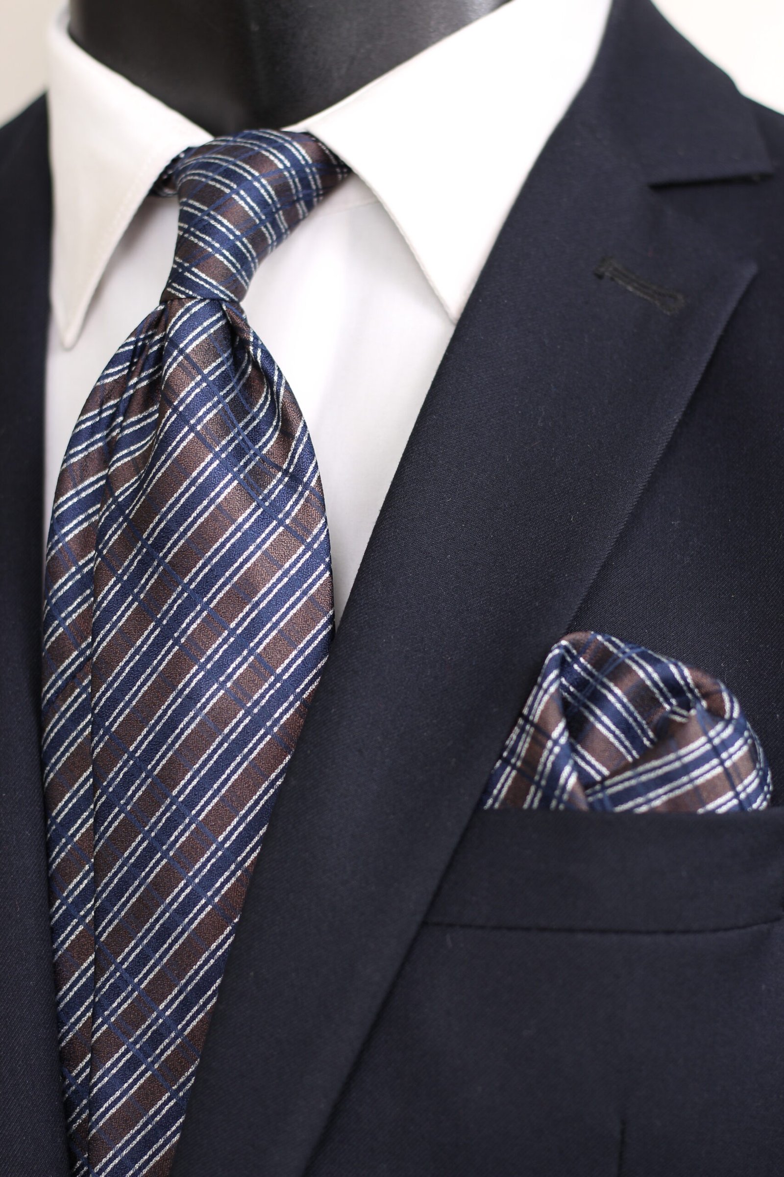 ✨ Elegant Navy, Brown, and White Plaid Patterned Tie and Pocket Square: This tie and matching pocket square showcase a striking navy blue tone with bold brown and white plaid patterns, giving them a timeless and polished appearance with a modern touch.