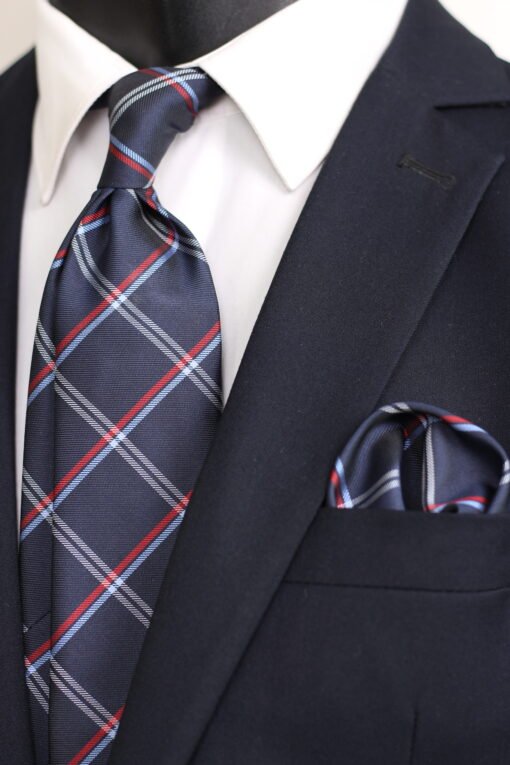 ✨ Elegant Navy, Red, and White Plaid Patterned Tie and Pocket Square: This tie and matching pocket square showcase a striking navy blue tone with bold red, white, and light blue plaid patterns, giving them a timeless and polished appearance with a modern touch.