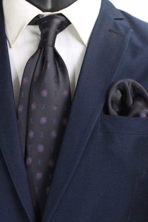 Dark Grey Tie with Orange and Blue Repeating Pattern and Matching Pocket Square Set – Subtle Style