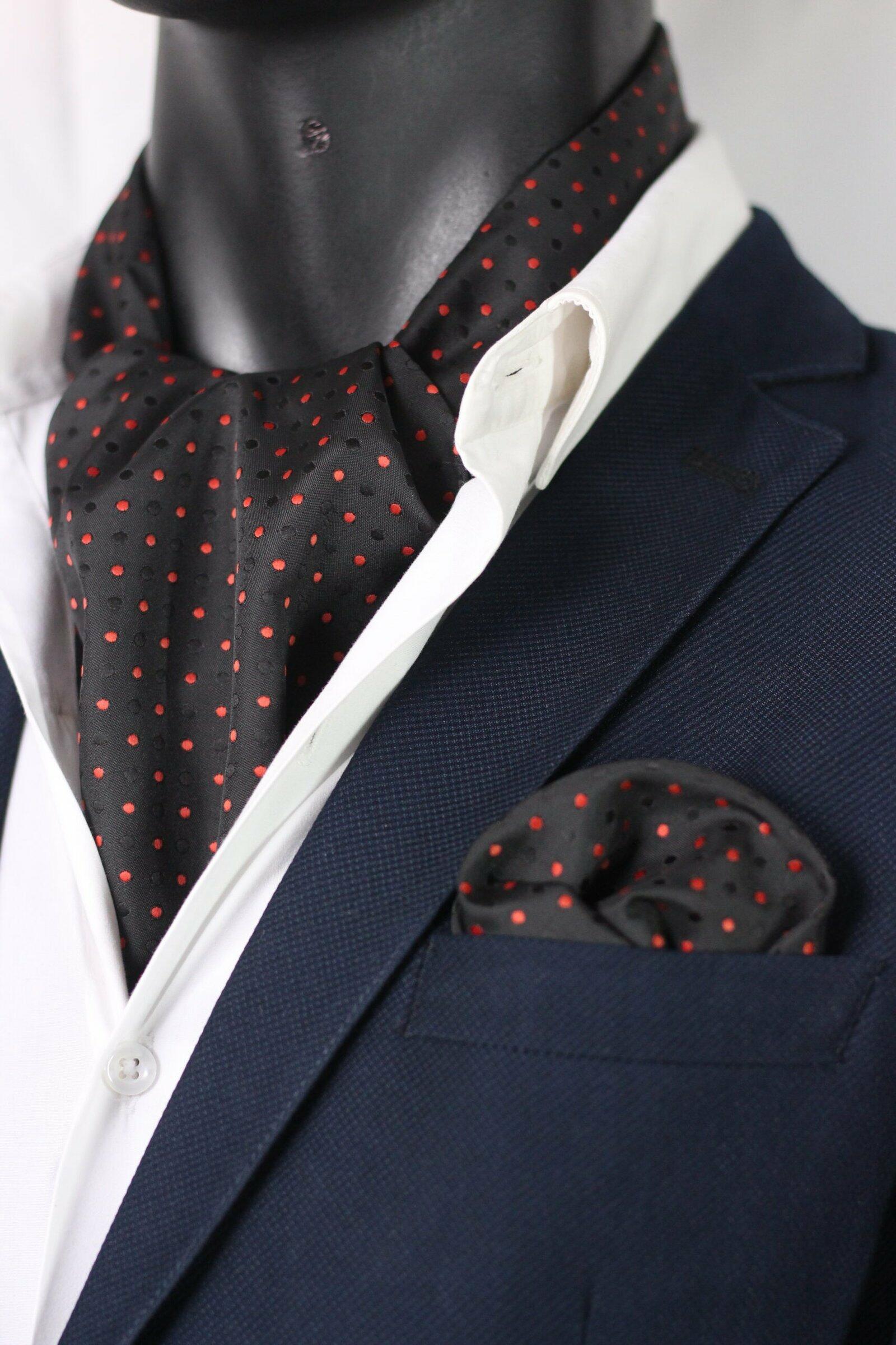 HomeBlack Ascot Dotted with HankyBlack Ascot Dotted with HankyDescriptionCommand attention with this luxurious black and red polka dot patterned ascot scarf for men. A sophisticated neck accessory featuring a distinctive dotted pattern, it's perfect for weddings, formal events, and elegant style .