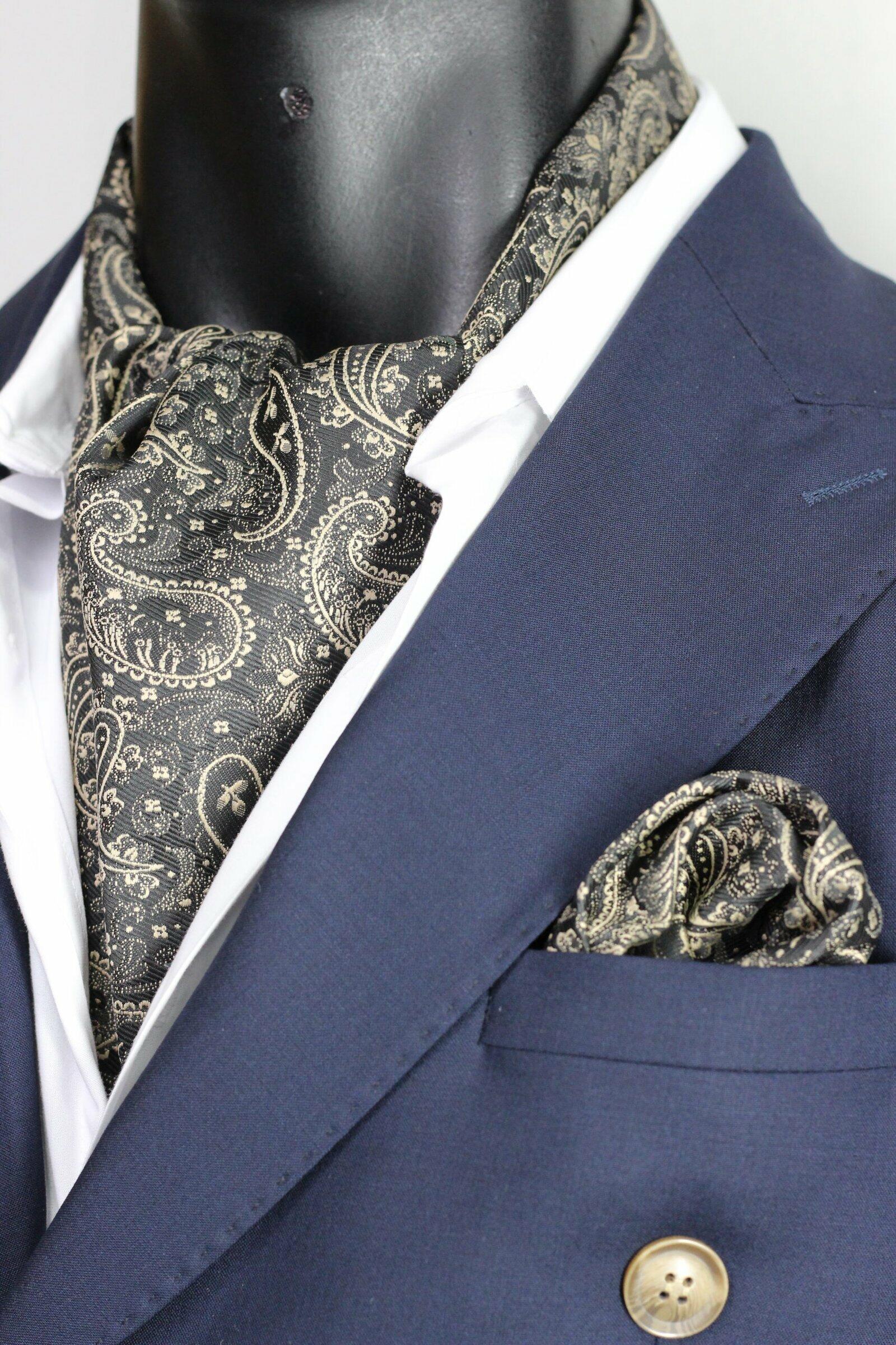 HomeBlack Ascot Paisley with HankyBlack Ascot Paisley with HankyDescriptionCommand attention with this luxurious dark grey and gold paisley patterned ascot scarf for men. A sophisticated neck accessory featuring a distinctive paisley pattern, it's perfect for weddings, formal events, and elegant style .